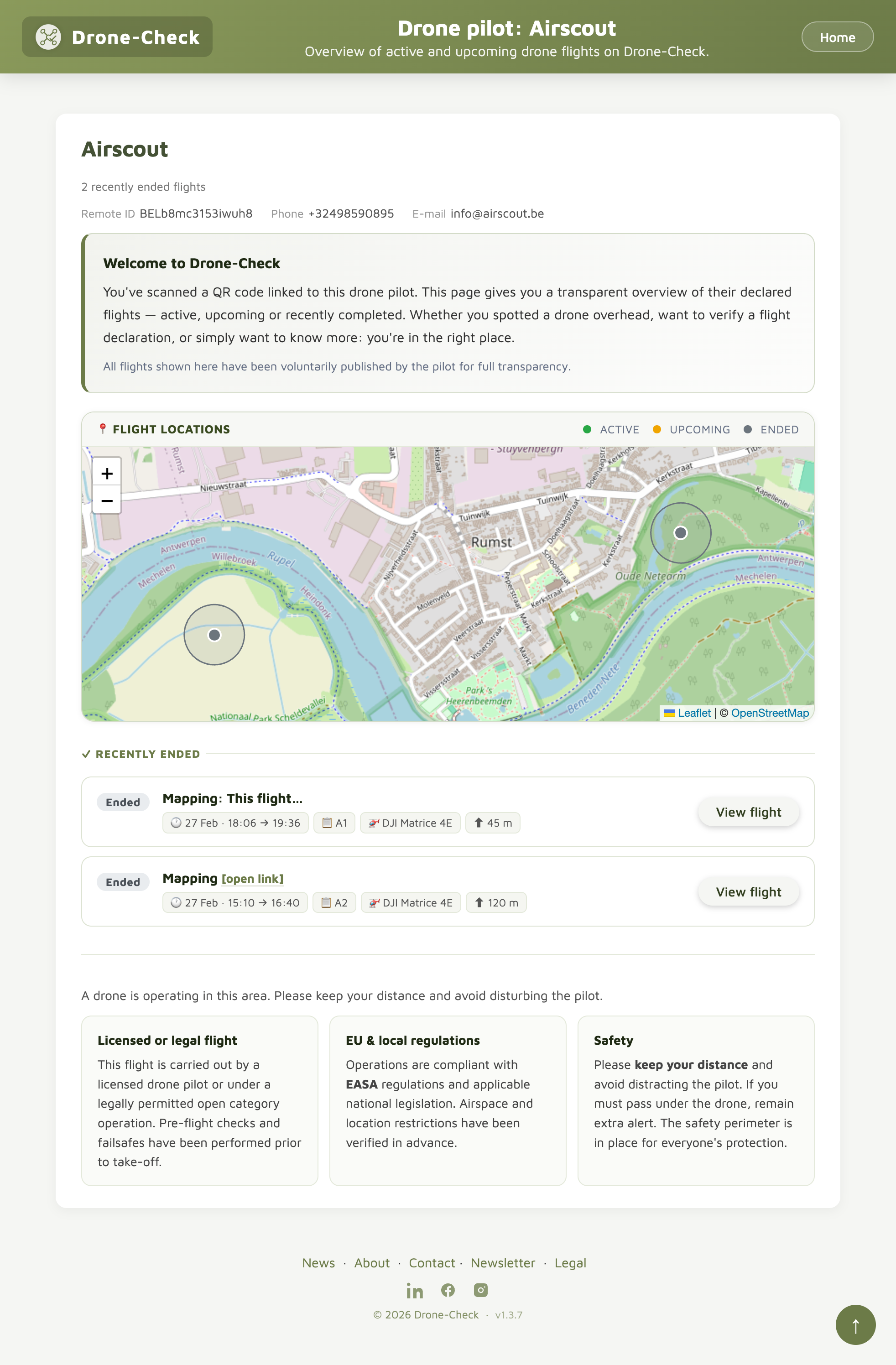 Every pilot also gets a dedicated Pilot Page — a permanent, public URL that shows the same live overview of active and upcoming flights. Share it directly, bookmark it, or link to it wherever relevant. No QR code needed. Your Pilot Page is always reachable at: www.drone-check.eu/pilot/youroperatorid